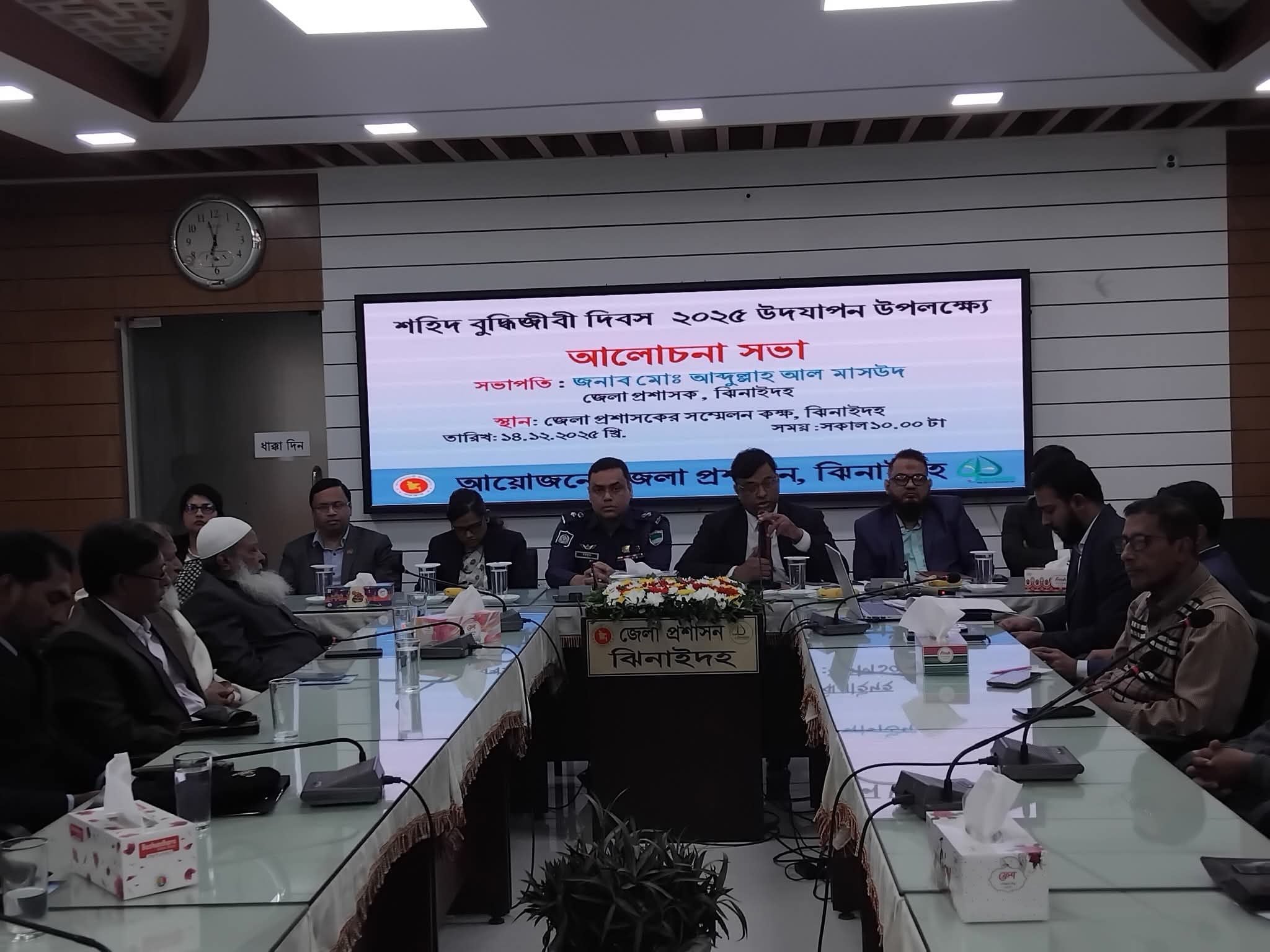 এম এ কবির,ঝিনাইদহ:ঝিনাইদহে যথাযোগ্য মর্যাদায় শহিদ বুদ্ধিজীবী দিবস পালিত হয়েছে। এ উপলক্ষে সকাল ১০ টায় ঝিনাইদহ জেলা প্রশাসকের সম্মেলন কক্ষে আলোচনা সভা অনুষ্ঠিত হয়। অতিরিক্ত জেলা প্রশাসক (সার্বিক) সাইফুর রহমানের সভাপত্বি অনুষ্ঠিত সভায় প্রধান অতিথি ছিলেন জেলা প্রশাসক আব্দুল্লাহ আল মাসউদ। বিশেষ অতিথি ছিলেন পুলিশ সুপার মাহফুজ আলফাজ, জেলা পরিষদের প্রধান নির্বাহী কর্মকর্তা সেলিম রেজা পিএএ,স্থানীয় সরকার বিভাগের উপপরিচালক রথীন্দ্রনাথ রায় এবং উপজেলা নির্বাহী অফিসার হোসনে আরা। বক্তব্য রাখেন, পিপি এবং বীর মুক্তিযোদ্ধা এ এ এস মশিউর রহমান,বীর মুক্তিযোদ্ধা আব্দুল মজিদ, বীর মুক্তিযোদ্ধা কামালুজ্জামান,ডাঃ মিথিলা ইসলাম, ঝিনাইদহ জেলা রিপোর্টার্স ইউনিটির সভাপতি এম এ কবীর, শিশু বিষয়ক কর্মকর্তা আয়ূব হোসেন রানা,জামায়াতের জেলা আমীর আলী আজম,ইসলামী আন্দোলন বাংলাদেশের আমীর এ এইচ এম মোমতাজুল করিম,গণঅধিকার পরিষদের জেলা সভাপতি সাখাওয়াত হোসেন এবং ছাত্র প্রতিনিধি সাইদুর রহমান।
